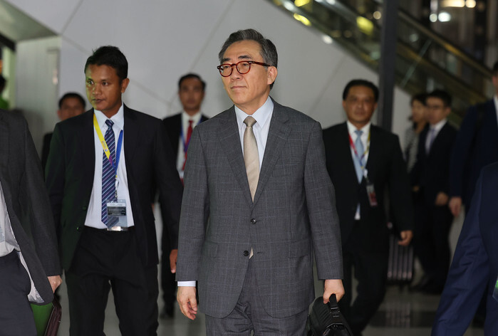 South Korean Foreign Minister Cho Tae-yul (C) arrives in Wattay International Airport in Vientiane, Laos, on July 25, 2024, to attend the Association of Southeast Asian Nations (ASEAN) Regional Forum (ARF). (Yonhap)