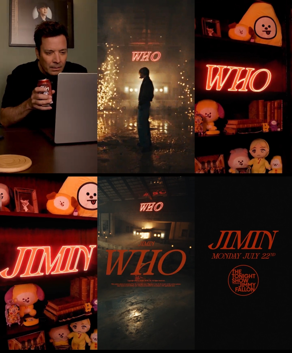 지미 팰런이 '닥터 지민'(Dr. Jimin)이라는 문구가 적힌 캔 음료를 마시며 노트북으로 지민의 무대를 감상하는 장면이 연출됐다. 이어 컷이 전환되면서 무대가 살짝 공개돼 궁금증을 자아냈다.