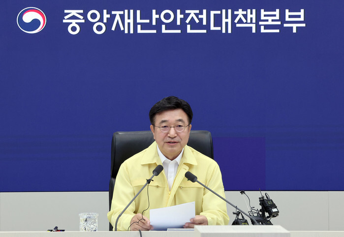 Interior and Safety Minister Yun Ho-jung speaks during a disaster response meeting of the Central Disaster and Safety Countermeasures Headquarters at the government complex in Sejong, central South Korea, on July 28, 2025, to deal with heat waves hitting the country and minimize possible damage. (Yonhap)