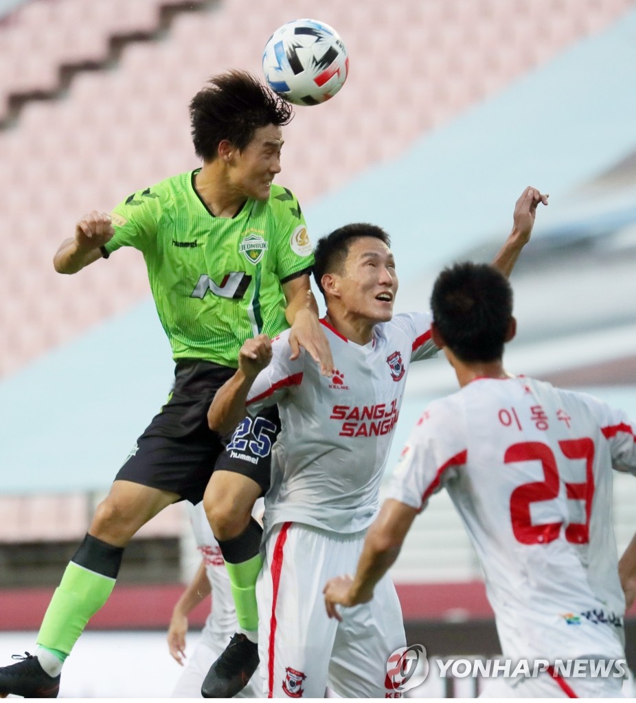 | ▲ In this file photo from Aug. 23, 2020, Choi Chul-soon of Jeonbuk Hyundai Motors (L) takes a header against Sangju Sangmu during a K League 1 match at Jeonju World Cup Stadium in Jeonju, 240 kilometers south of Seoul. (Yonhap) |