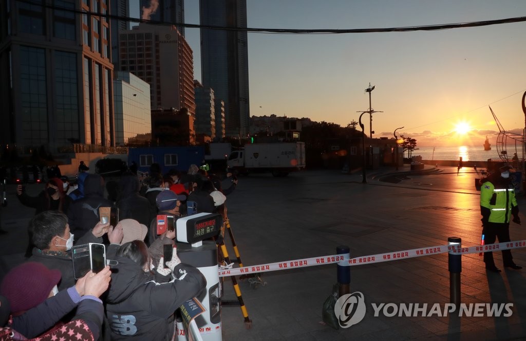 (부산=연합뉴스) 손형주 기자 = 신축년(辛丑年) 새해 첫날인 1일 오전 해맞이 행사가 취소된 해운대해수욕장 등 부산 주요 일출 명소는 비교적 차분한 분위기 속에 새해 첫날을 맞았지만, 일부 통제선 밖 인도는 인파로 붐볐다.