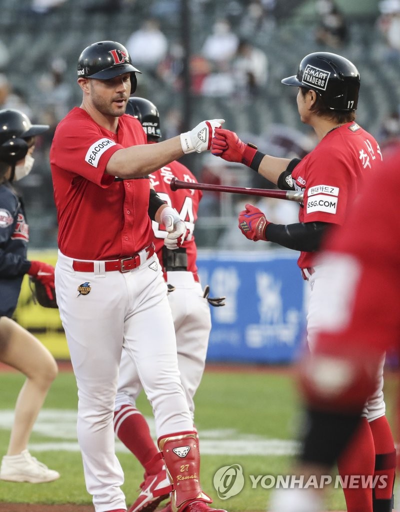 | ▲ In this file photo from May 13, 2021, Jamie Romak of the SSG Landers (L) bumps fists with teammate Choo Shin-soo after hitting a two-run home run against the Lotte Giants in the top of the first inning of a Korea Baseball Organization regular season game at Sajik Stadium in Busan, 450 kilometers southeast of Seoul. (Yonhap) |