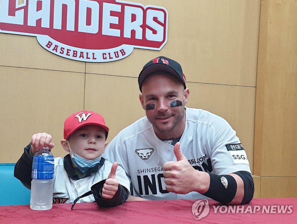 | ▲ In this file photo from April 20, 2021, Jamie Romak of the SSG Landers (R) poses with his son, Nash, at Incheon SSG Landers Field in Incheon, 40 kilometers west of Seoul. (Yonhap) |