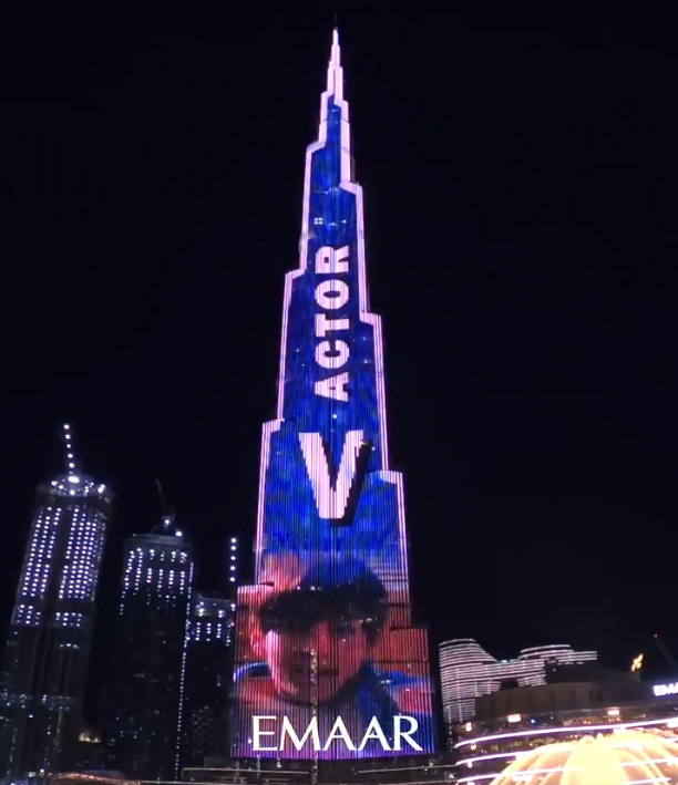 'HAPPY V DAY', 'KIM TAEHYUNG'(뷔 본명), 'BTS V', 'WE PURPLE U' 등 축하 메시지와 뷔의 사진 등이 163층, 828m 높이의 건물 외벽 전체를 뒤덮었다.