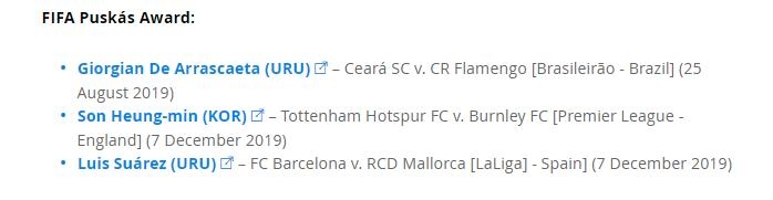 이를 바탕으로 지난달 발표된 FIFA의 '더 푸슈카시 어워드' 후보 11명에 포함됐던 손흥민은 이날 히오르히안 데 아라스카에타(플라멩구), 루이스 수아레스(바르셀로나)와 함께 최종 후보 3인에 포함됐다.