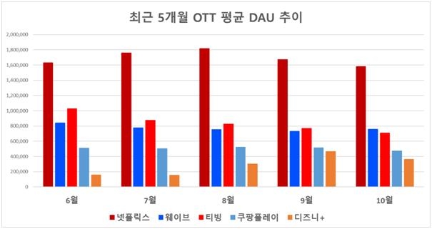 디즈니플러스의 경우 '무빙'과 '최악의 악' 등 히트작을 내며 DAU가 8월 30만 명, 9월 47만 명까지 올랐지만, 10월에는 36만 명으로 줄며 5위로 밀려났다.