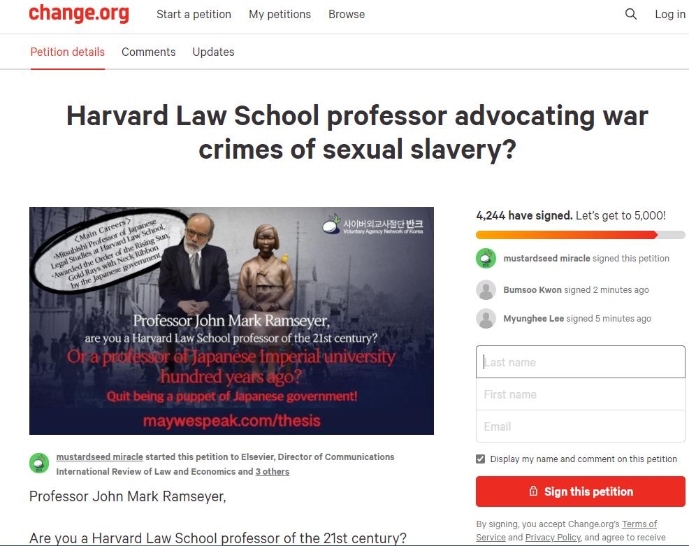 (서울=연합뉴스) 왕길환 기자 = 사이버 외교 사절단 반크는 '위안부는 매춘부'라는 내용의 논문을 작성한 마크 램지어 하버드대 로스쿨 교수와 해당 논문을 게재할 예정인 국제 학술지 편집인들에게 논문을 철회하라고 요구하는 항의 이메일을 보냈다고 8일 밝혔다.