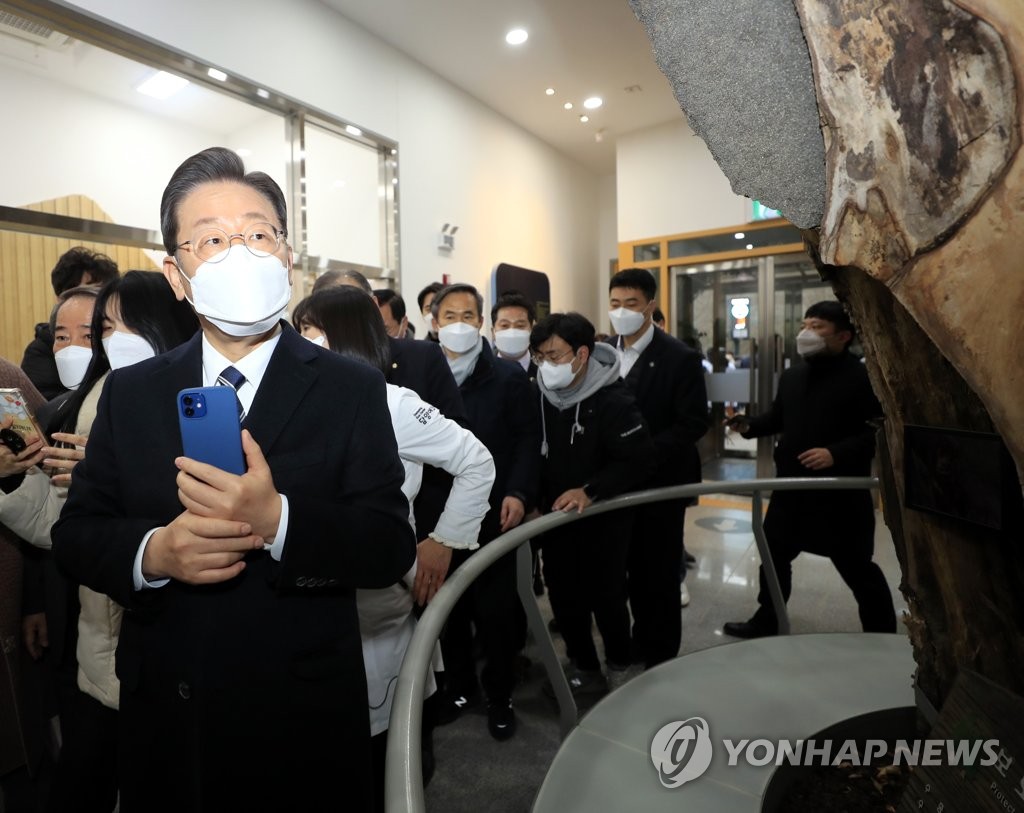 | ▲ 담양 에코센터에서 설명 듣는 이재명 대선후보 (담양=연합뉴스) 백승렬 기자 = 더불어민주당 이재명 대선후보가 5일 전남 담양군 담양읍 담양 에코센터 호남기후변화체험관을 방문, 링거 맞는 나무에 관해 설명을 듣고 있다. 2022.1.5 srbaek@yna.co.kr |