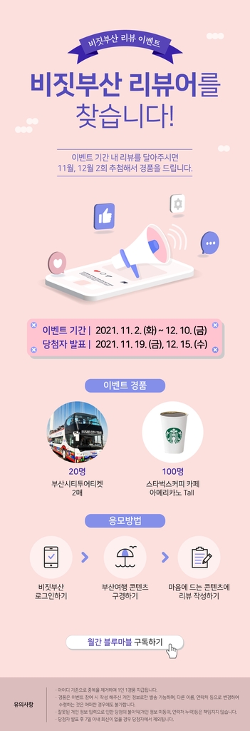 ▲ 부산관관공사는 2일부터 다음 달 10일까지 부산 관광 포털사이트 '비짓 부산'(Visit Busan)을 활용한 이벤트를 한다. '비짓 부산'은 부산의 숨겨진 여행지부터 인기 여행코스, 다양한 행사·축제 정보까지 부산 여행에 필요한 모든 정보를 5개 국어(한국어, 영어, 중국어간체, 중국어번체, 일본어)로 제공한다. 행사 기간에 다양한 부산 여행 콘텐츠를 둘러보며 가고 싶은 여행지를 찾아 의견을 작성하면 부산시티투어 티켓 2장(20명), 스타벅스 커피 쿠폰(100명)을 경품으로 제공한다. (부산=연합뉴스)