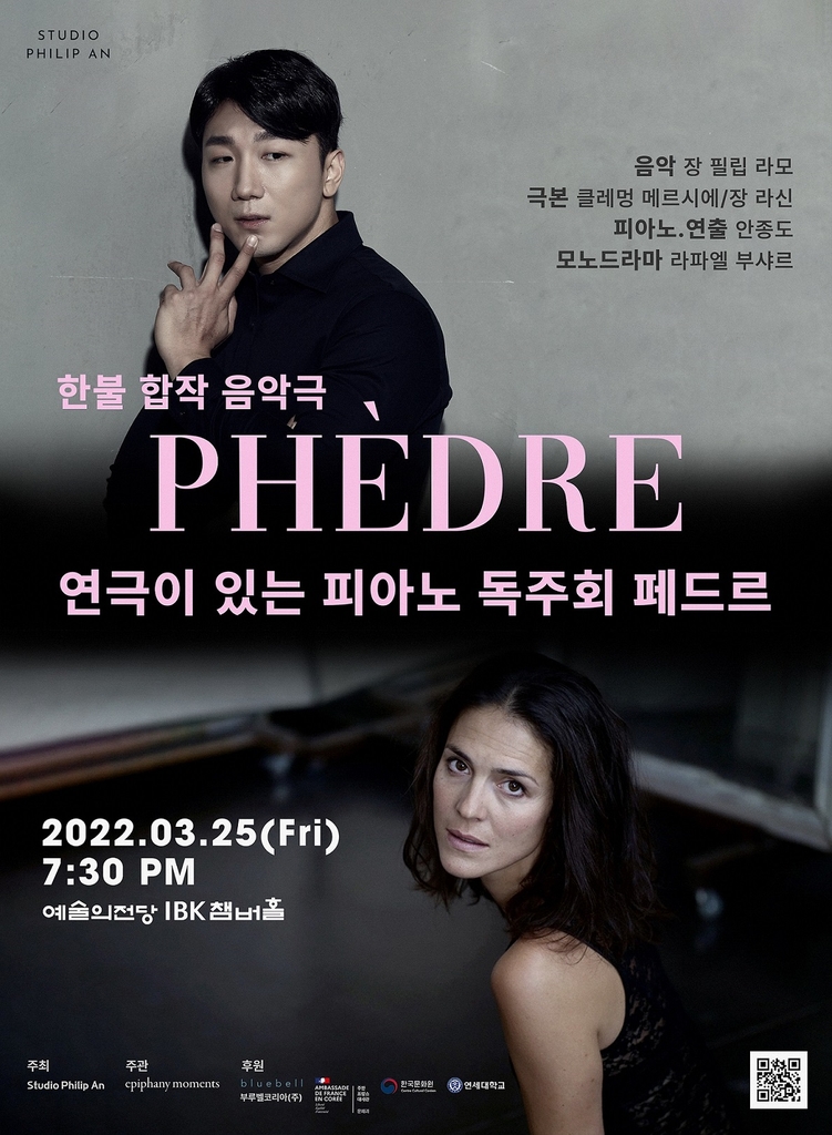 공연 주관사인 에피파니모먼츠는 2012년 롱티보 국제 피아노 콩쿠르 우승자 안종도와 프랑스 배우 라파엘 부샤르가 무대에 오르는 한불 합작 음악극 '페드르'를 오는 25일 서울 예술의전당 IBK챔버홀에서 선보인다고 16일 밝혔다.