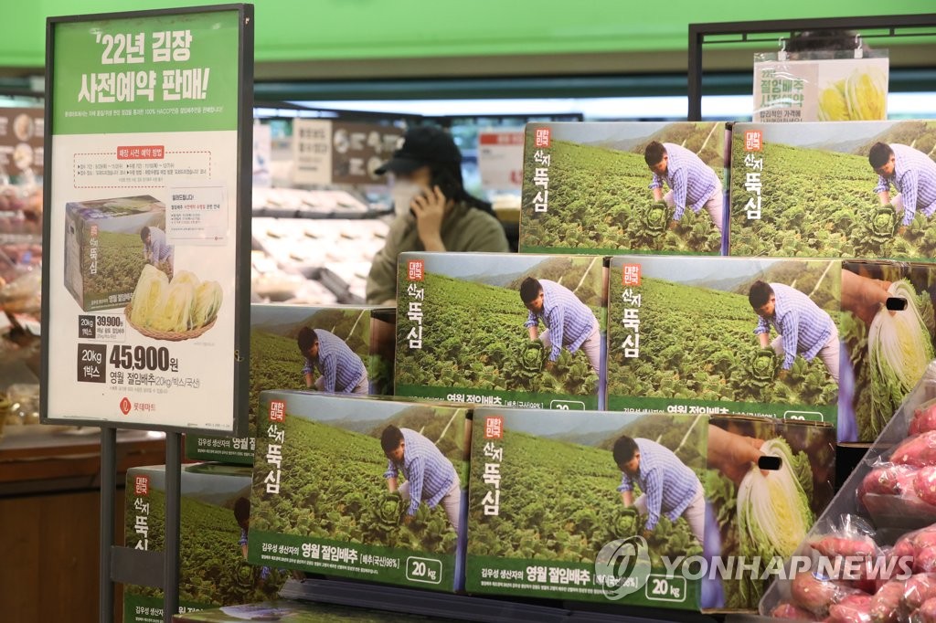 | ▲ 김장 앞두고 절임배추 판매 (서울=연합뉴스) 강민지 기자 = 김장철을 앞둔 6일 서울의 한 대형마트에 절임배추 예약판매 안내문이 내걸려 있다. 2022.10.6 mjkang@yna.co.kr |