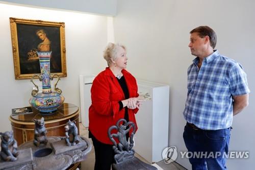 | ▲ 알카포네의 손녀 다이앤 카포네와 경매업체 위더렐 대표 브라이언 위더렐 (시카고 로이터=연합뉴스) 지난 8일(현지시간) 알카포네의 손녀 다이앤 카포네와 경매업체 위더렐 대표 브라이언 위더렐이 알카페네 유품 경매와 관련해 대화를 나누고 있다. 2021.10.13 photo@yna.co.kr |