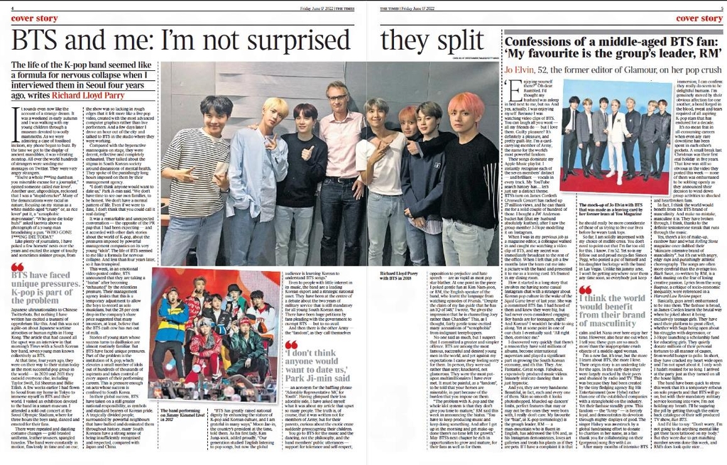 이 신문의 아시아 에디터 리처드 로이드 패리는 'BTS와 나: 활동 중단에 놀라지 않았다'는 제목의 기사에서 성장할 시간을 주지 않고 혹사하는 아이돌 시스템과 팬덤 문화를 비판했다.
