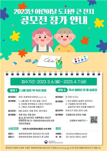 ▲ 국립어린이청소년도서관 '어린이날 도서관 큰 잔치' 공모전 = 국립어린이청소년도서관은 다음 달 7일까지 '어린이날 도서관 큰 잔치' 행사의 하나로 그림·슬로건 공모전을 연다.