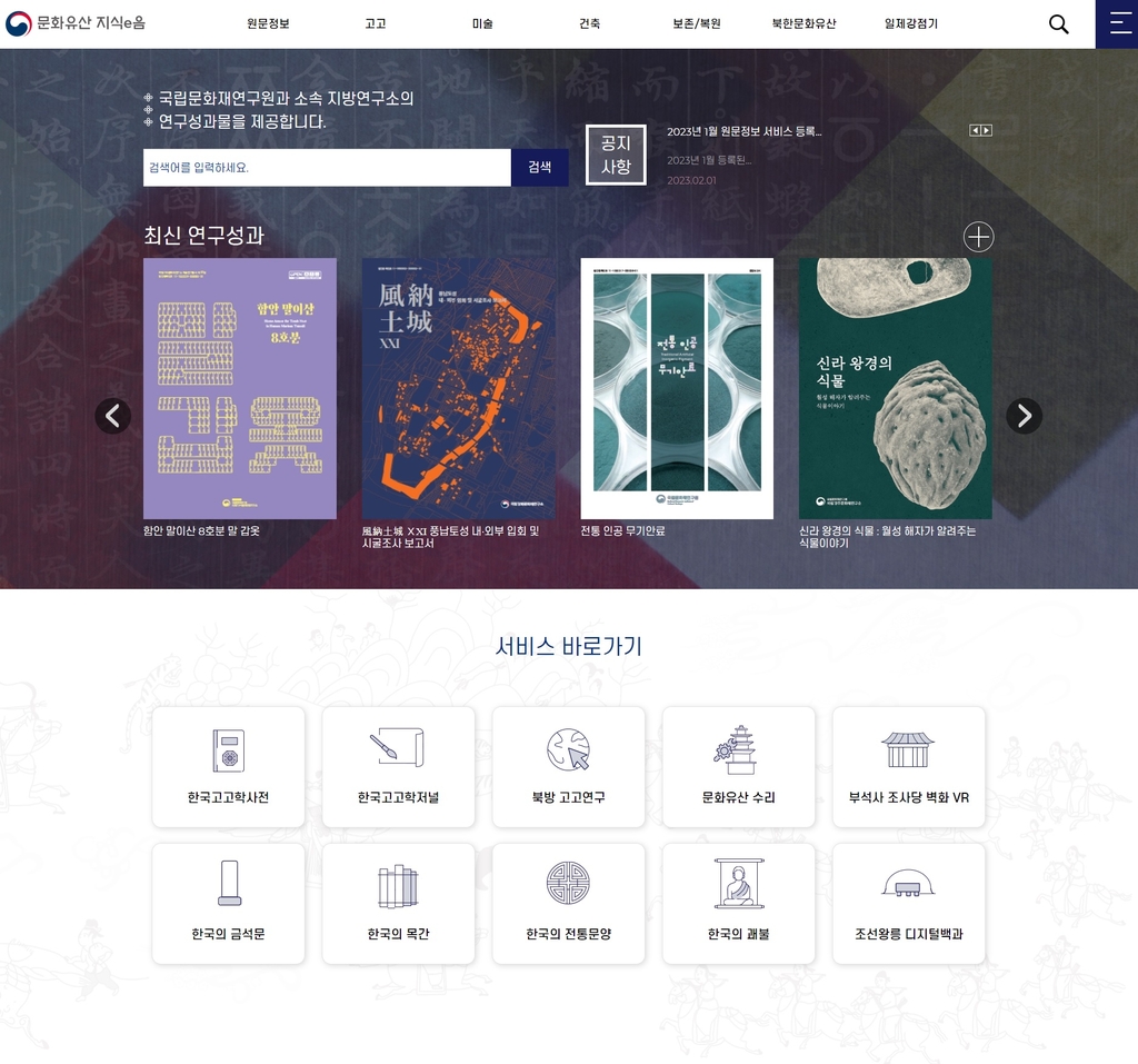 고고학·미술·건축·자연유산·보존과학 등 분야별로 축적된 자료 약 37만 건을 비롯해 산하 7개 연구소의 최신 연구 성과를 자유롭게 찾아볼 수 있다.