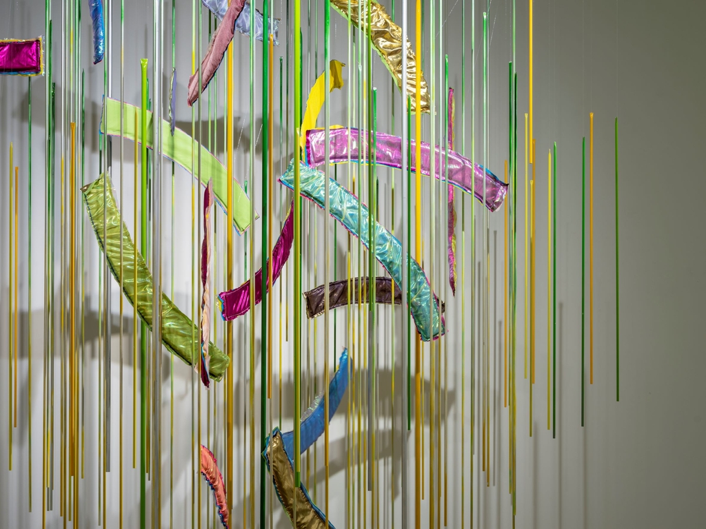 지하 전시장에는 색띠를 캔버스 밖으로 꺼낸 설치 작업이 놓였다. 알루미늄 막대 수십 개와 색띠를 섬유로 구현한 섬유밴드들로 구성된 작품이다.