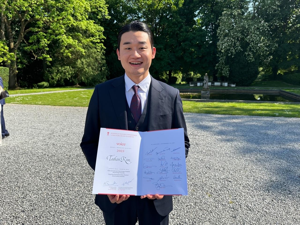 | ▲ 퀸엘리자베스 콩쿠르 시상식 참석한 김태한 (워털루[벨기에]=연합뉴스) 정빛나 특파원 = 지난 4일(현지시간) 벨기에 '퀸 엘리자베스 콩쿠르'에서 우승한 바리톤 김태한(22)이 6일 벨기에 브뤼셀 인근 워털루에서 열린 공식 시상식에서 상장을 들고 기념사진을 촬영하고 있다. 2023.6.6 shine@yna.co.kr [재판매 및 DB 금지] |