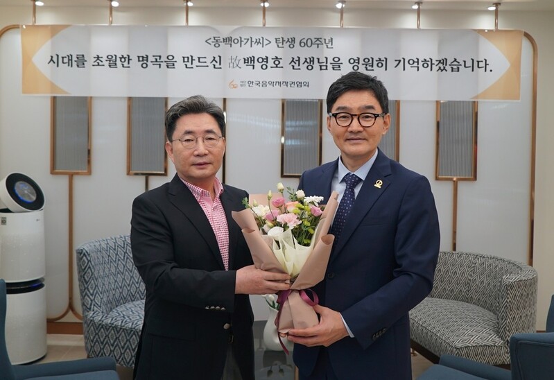 | ▲ 가요 '동백아가씨' 탄생 60주년 기념식 왼쪽부터 백경권 백영호기념관장, 추가열 한국음악저작권협회장 [한국음악저작권협회 제공. 재판매 및 DB 금지] |