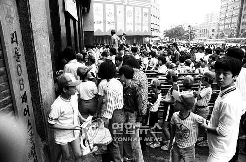 | ▲ 1982년 경기장 매표구에 어린이 팬들 장사진 프로야구 원년인 1982년 OB 베어스 경기를 보기 위해 모여든 어린이 야구팬들. [연합뉴스 자료사진] |