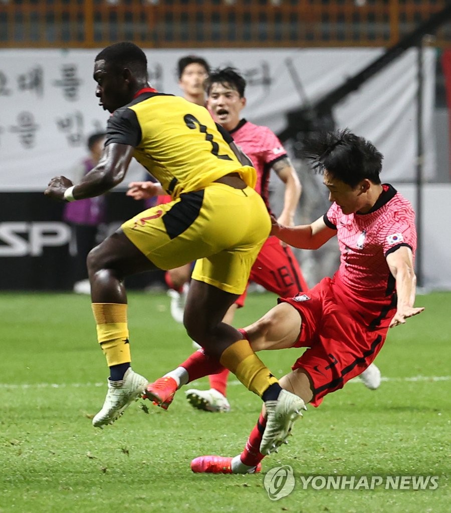 | ▲ Um Won-sang (R) of the South Korean men's Olympic football team collides with Frank Amoabeng of Ghana in a friendly match at Jeju World Cup Stadium in Seogwipo, Jeju Island, on June 12, 2021. (Yonhap) |