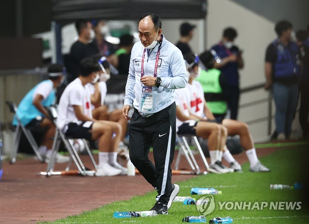 | ▲ Kim Hak-bum, head coach of the South Korean men's Olympic football team, walks in front of his bench during a friendly match against Ghana at Jeju World Cup Stadium in Seogwipo, Jeju Island, on June 12, 2021. (Yonhap) |