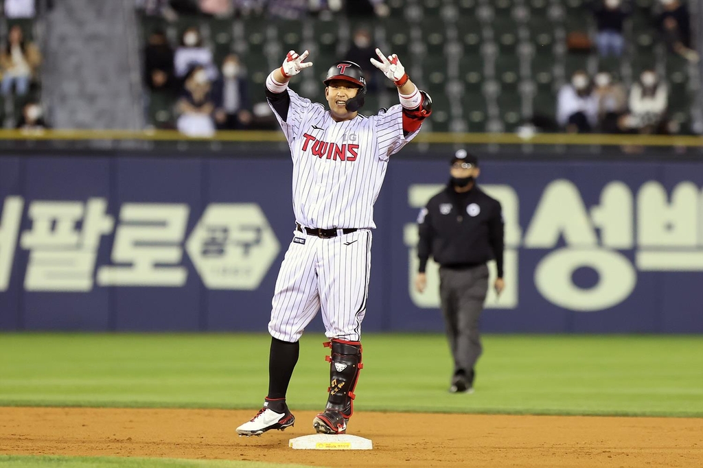 | ▲ Yoo Kang-nam of the LG Twins celebrates his double against the Doosan Bears during the bottom of the seventh inning of a Korea Baseball Organization regular season game at Jamsil Baseball Stadium in Seoul on May 3, 2022, in this photo provided by the Twins. (PHOTO NOT FOR SALE) (Yonhap) |