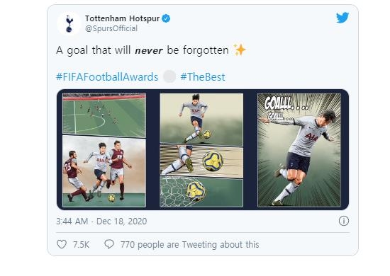 | ▲ 손흥민의 푸슈카시상 수상을 축하한 토트넘. [토트넘 트위터. 재판매 및 DB 금지] |