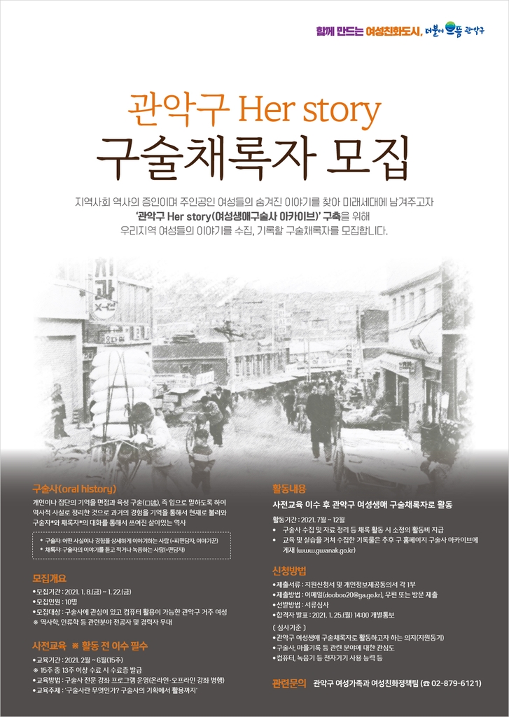 구는 체계적인 기록 수집과 관리를 위해 '관악 허스토리 구술채록단'을 모집·양성한다. 오는 22일까지 구술사에 관심이 있고 컴퓨터 활용이 가능한 관악구 거주 여성 10명을 모집한다.