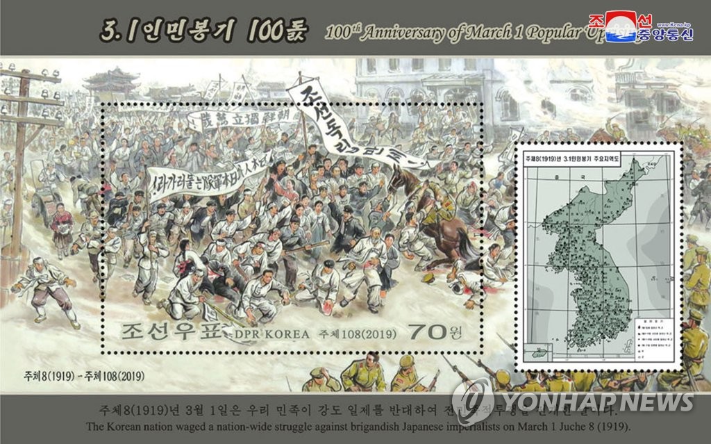 | ▲ 북한 국가우표발행국이 지난 2019년 3월 1일 '3·1인민봉기(3·1운동)' 100주년을 맞아 발행한 기념우표 [조선중앙통신=연합뉴스 자료사진] [국내에서만 사용가능. 재배포 금지. For Use Only in the Republic of Korea. No Redistribution] photo@yna.co.kr |