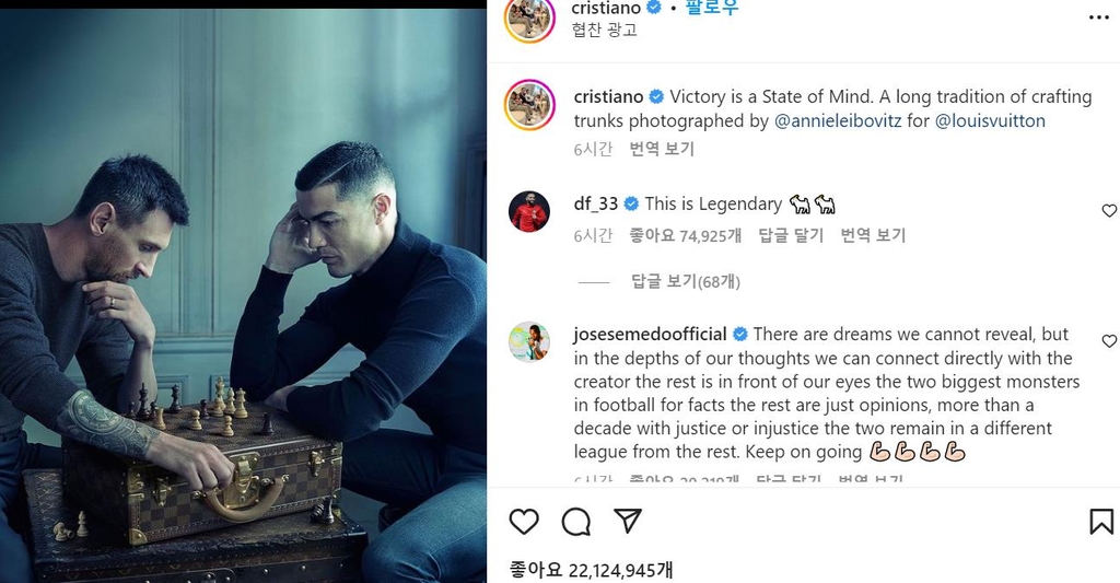 이 사진은 20일 오전 기준 호날두의 계정에서는 2천200만여개의 '좋아요'를, 메시의 계정에서는 1천800만여개의 '좋아요'를 받는 등 실시간으로 전 세계 축구 팬들의 이목을 끌고 있다.