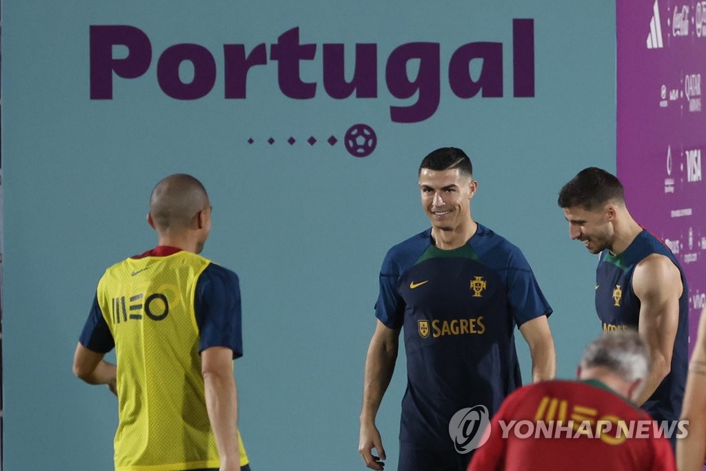 | ▲ 적응훈련 시작한 호날두와 디아스 (도하=연합뉴스) 김주성 기자 = 2022 카타르 월드컵에서 한국과 조별리그 3차전을 치르는 포르투갈 축구대표팀의 크리스티아누 호날두(가운데)와 후벵 디아스(오른쪽)가 19일 오후(현지시간) 카타르 도하 외곽 알샤하니야 SC 훈련장에서 첫 적응훈련을 하던 중 환하게 웃고 있다. 2022.11.20 utzza@yna.co.kr |
