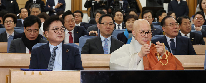 National Assembly Speaker Woo Won-shik (L, front) and Ven. Jinwoo (R, front), chief of the Jogye Order, South Korea's largest Buddhist sect, attend a Buddhist ritual involving a group of Buddhist lawmakers, known as Jeonggakhoe, for New Year at the parliamentary building in Seoul on March 5, 2025. (Yonhap)