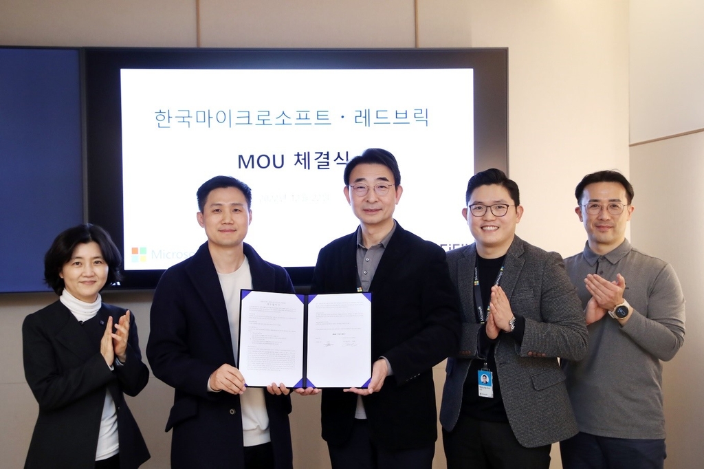 | ▲ 한국마이크로소프트·레드브릭 업무협약식 이광용 레드브릭 총괄이사(왼쪽 두번째)와 이상현 한국마이크로소프트 공공사업부문장(가운데) [레드브릭 제공. 재판매 및 DB 금지] |
