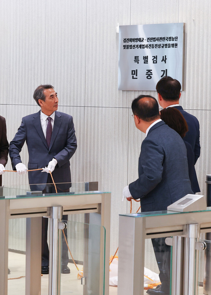 Special counsel Min Joong-ki (L) takes part in a ceremony at his office in Seoul on July 2, 2025, to unveil a plaque displaying the Korean name of the special counsel team investigating various allegations related to Kim Keon Hee, the wife of ousted former President Yoon Suk Yeol. (Yonhap)