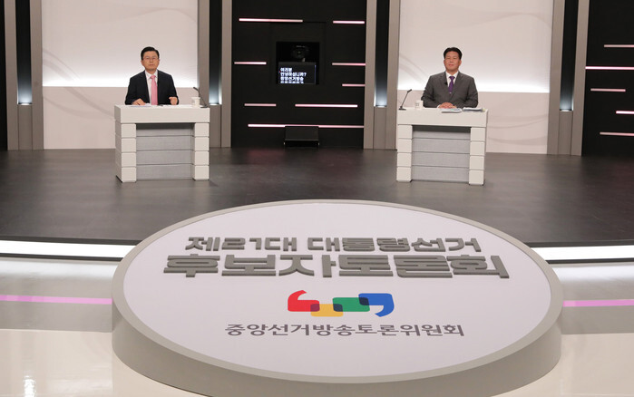The two independent presidential candidates -- Hwang Kyo-ahn (L) and Song Jin-ho -- attend their first televised debate, hosted by broadcaster SBS, on May 19, 2025, in this photo released by the National Election Broadcasting Debate Commission. (Pool photo) (Yonhap)