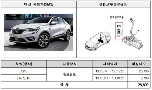 Renault Korea will recall 28,892 cars of two models, including the XM3, as a damaged fuel pump impeller could cause the cars to stall, according to the Ministry of Land, Infrastructure and Transport.