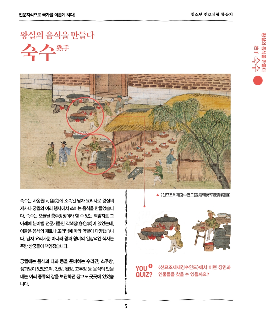 숙수는 지금의 요리사로, 잔치 때 음식을 전문으로 만드는 직업인을 일컫는다. 조선시대 궁궐 연회를 묘사한 '선묘조제재경수연도'(宣廟朝諸宰慶壽宴圖)에서 숙수들의 모습을 엿볼 수 있다.
