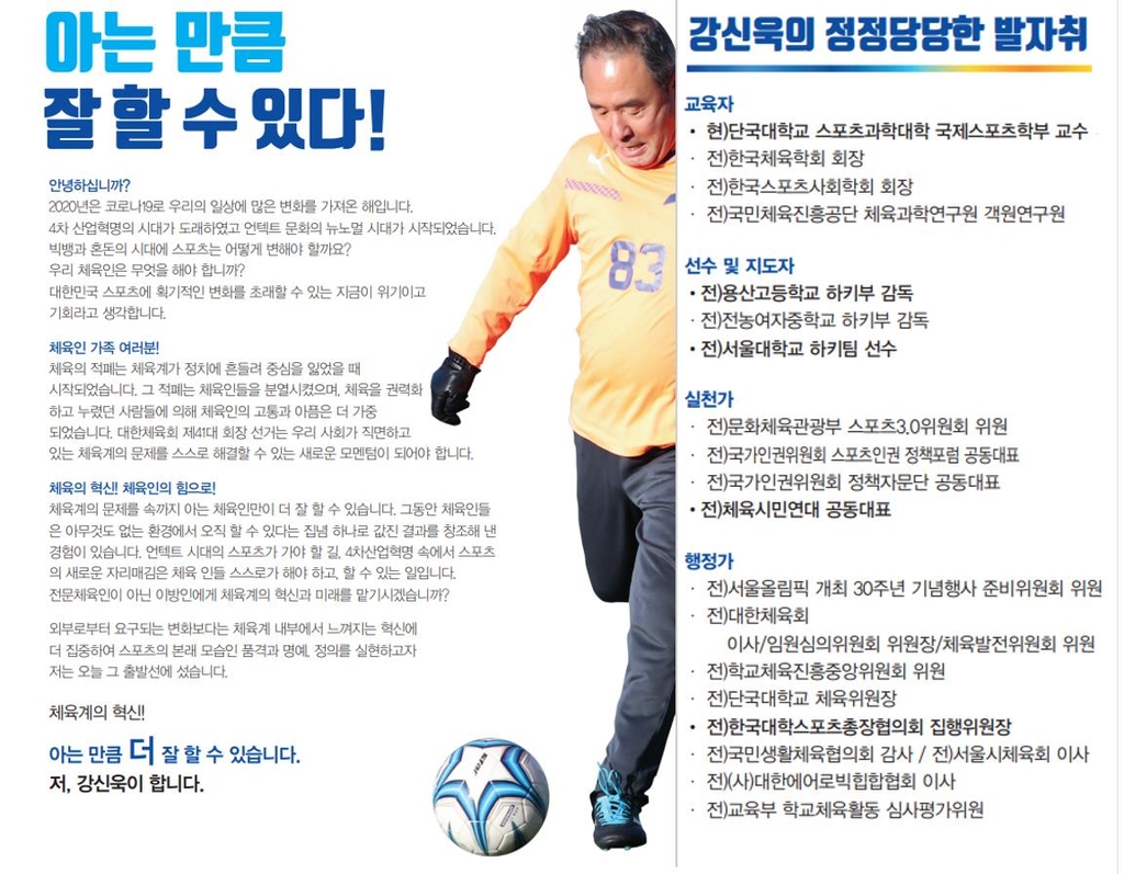 하키인 출신으로 단국대에서 후학을 가르친 학자인 강신욱 후보도 코로나19 탓에 접촉이 어려운 점을 고려해 전화와 휴대전화 문자 메시지 등으로 체육인들에게 지지를 부탁하며 세를 넓히고 있다.