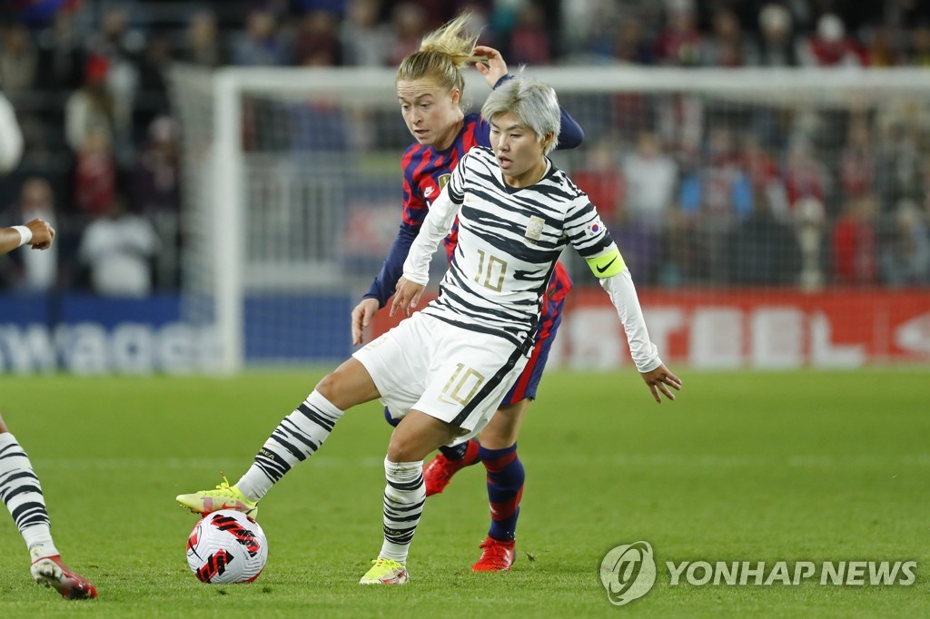 | ▲ In this USA Today Sports photo via Reuters from Oct. 26, 2021, Ji So-yun of South Korea (front) keeps the ball away from Emily Sonnett of the United States during a friendly football match at Allianz Field in St. Paul, Minnesota. (Yonhap) |