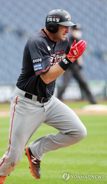 | ▲ In this file photo from May 24, 2020, Jared Hoying, then of the Hanwha Eagles, legs out an infield single against the NC Dinos in the top of the eighth inning of a Korea Baseball Organization regular season game at Changwon NC Park in Changwon, 400 kilometers southeast of Seoul. (Yonhap) |