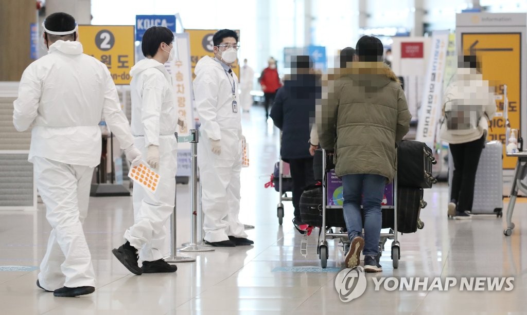 | ▲ This photo taken on Jan. 19, 2021, shows health workers clad in protective suits guiding arrivals at Incheon International Airport in Incheon. (Yonhap) |