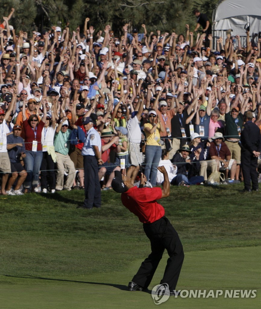 | ▲ 2008년 US오픈에서 연장으로 가는 4m 버디 퍼트를 넣고 환호하는 우즈. [AP=연합뉴스] |