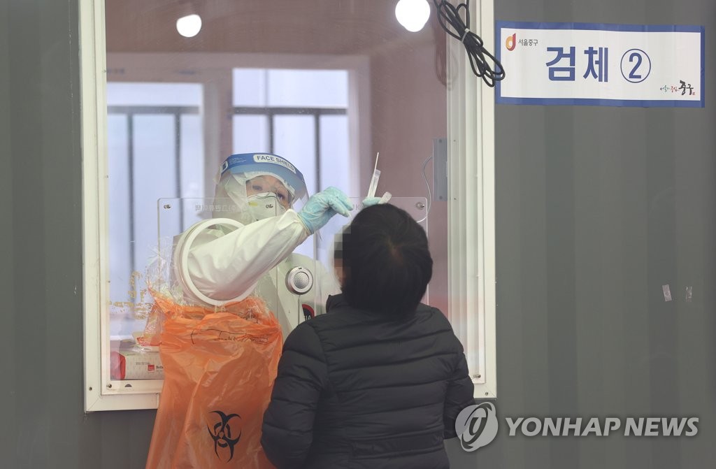 | ▲ A health worker collects a sample from a citizen for a COVID-19 test at a makeshift virus testing clinic in Seoul on March 13, 2021. (Yonhap) |