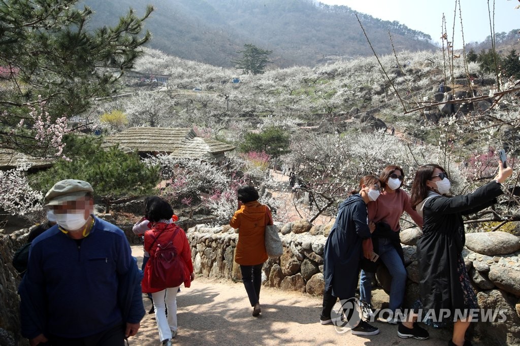 | ▲ Masked visitors enjoy apricot blossoms in Gwangyang's Maehwa Village, 423 kilometers south of Seoul, on March 10, 2021. (Yonhap) |