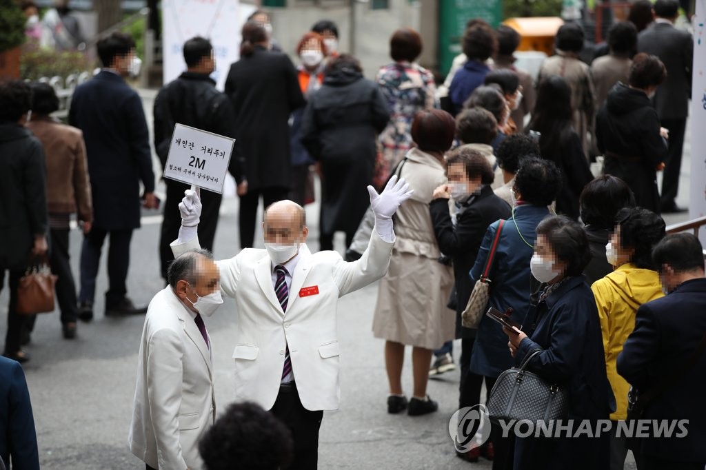 | ▲ Worshipers wait in lines at a church in western Seoul to participate in Easter Mass amid the pandemic on April 4, 2021. (Yonhap) |