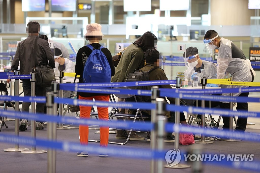 ▲ People wait in a line at an arrival hall of Incheon International Airport, west of Seoul, on April 6, 2021. (Yonhap)