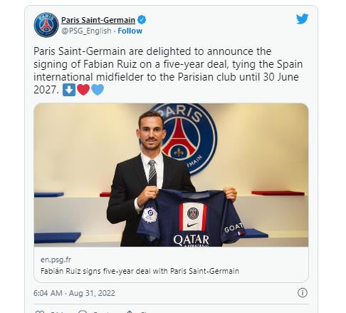 | ▲ 파비안 루이스의 영입을 알린 파리 생제르맹. [파레 생제르맹 SNS. 재판매 및 DB 금지] |
