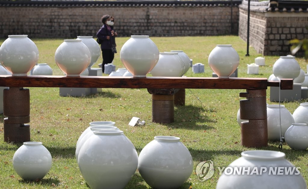More than 130 vases made by Shin Chul, a ceramic artist known for making white porcelain vases in a traditional way, sit on the lawn in front of Sujeong Pavillion located south of a man-made pond.