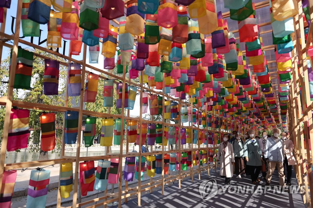 SEOUL, Oct. 20 (Yonhap) -- On a sunny autumn afternoon, hundreds of traditional Korean lanterns with silk shades of all different colors fluttered gently in the breeze at a courtyard of the Gyeongbok Palace in central Seoul.