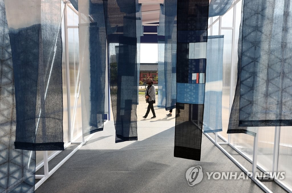 The tour began at an exhibition hall set up in front of Geunjeong Gate to display natural dyeing culture of Naju, South Jeolla Province. About 130 all bluish artworks and various living items such as traditional Korean curtains, umbrellas, eco bags, cushions and masks made by 11 artists, including Youn Young-sook, from naturally dyed indigo fabric caught eyes of visitors.
